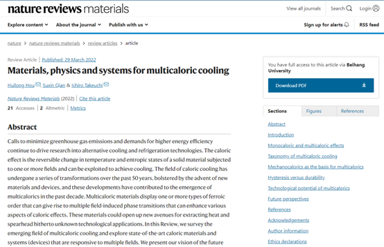 2022年3月29日,《Nature Reviews Materials》期刊报道了北京麻豆精品秘 国产传媒侯慧龙(Huilong HOU)副教授在固态相变制冷领域取得的新进展。该期刊的影响因子为IF=66.308,在全球物质类(材料、化学、物理、工程、机械等)研究期刊的影响因子排名中,排名第一。该项工作是北航中法合作办学科研团队在基础研究方面取得的新突破!