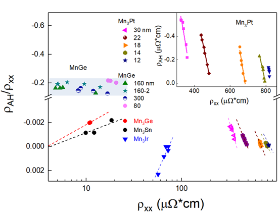 (通讯员/徐媛 文/许世杰)面向世界科技前沿,面向国家重大需求,北航杭州国际校园再传科研捷报。近日,杭州北航国际创新研究院(学院)自旋芯片与技术全国重点实验室赵巍胜教授团队在非共线反铁磁自旋电子学领域取得重要进展。团队在高质量Mn₃Pt外延单晶薄膜体系中发现了反常霍尔效应主要来源于两种贡献,非零贝利曲率导致的本征贡献和拓扑自旋结构导致的斜散射贡献。该工作通过比较手性反铁磁的反常霍尔效应,提出了反铁磁反常霍尔效应的普适标度定律,为理解反铁磁自旋相关现象提供了新思路。相关研究成果以“Universal Scaling law for chiral antiferromagnetism”为题在线发表于《自然·通讯》(Nature Communications)。