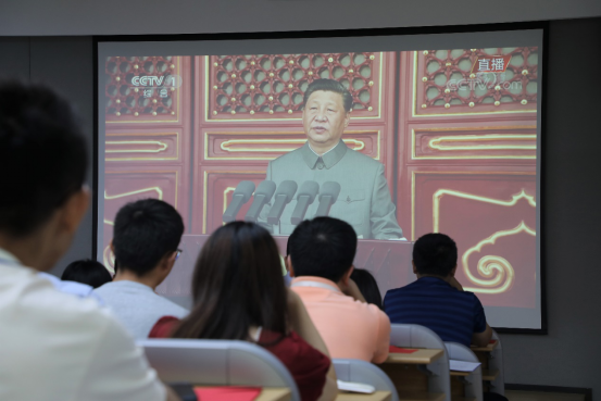 当雄壮的军乐声、威严的礼炮声、朗朗的献词声在天安门广场上空回荡,全体师生心潮澎湃,爱党爱国之情油然而生。大家仔细聆听并认真学习了中共中央总书记、国家主席、中央军委主席习近平发表的重要讲话,多次爆发出热烈而持久的掌声和欢呼声。观礼师生隔着屏幕与现场千万观众共同在习近平总书记振臂高呼“伟大、光荣、正确的中国共产党万岁!伟大、光荣、英雄的中国人民万岁!”时情不自禁起立鼓掌,挥舞手中的党旗,现场成为一片红色欢呼的海洋!