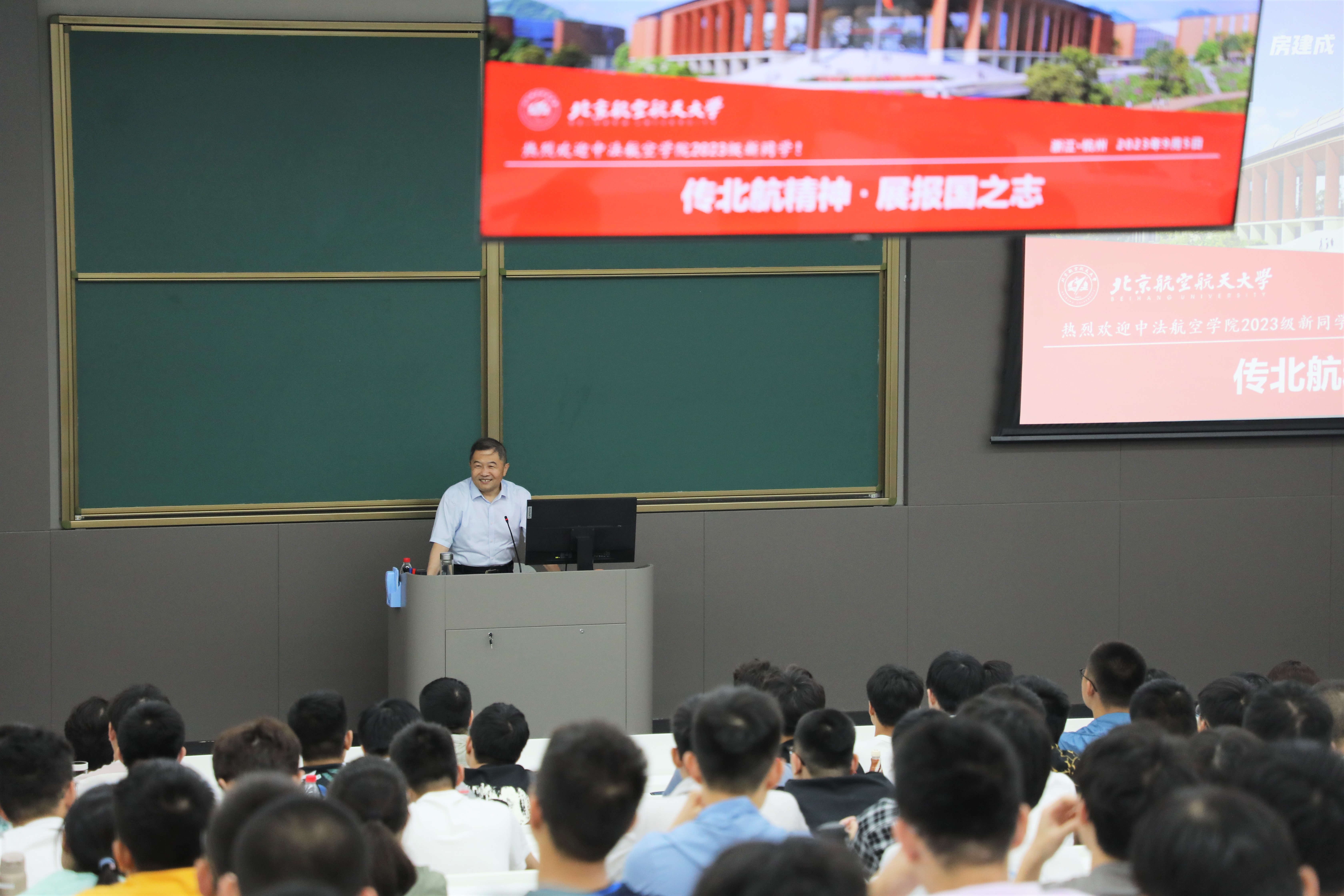 房建成院士首先向中法航空学院首届新生表示热烈欢迎,对他们选择北航、成为新一代北航人表示衷心祝贺。房建成院士围绕北航精神、北航志向这一主题,从北航建校背景出发,以风趣幽默的话语,用一个个生动活泼的故事,娓娓讲述了北航创立之初建校元老们筚路蓝缕、艰苦奋斗的精神,诠释了北航人“空天报国,敢为人先”的使命担当,展示了北航服务国家战略需求、承接国家重大科技项目的瞩目成绩。房建成院士强调,几代北航人传承先辈们空天报国的情怀、敢为人先的担当,锐意进取,敢于创新。“同学们,第一代北航人出了好几个院士,你们也是学院的第一代!未来要靠你们啊!”普言素语,却承载着房建成院士对新生的殷切希望。