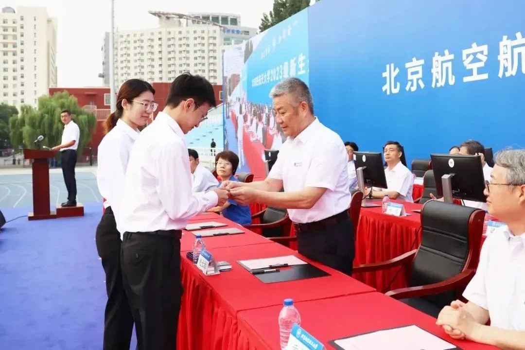 校党委书记赵长禄为新生代表授予校徽,中法航空学院2023级本科新生也齐将校徽佩戴在胸前。新生与北航的双向奔赴变得真实而坚固,历史的光辉此刻再闪耀,北航人的初心同频再传承。