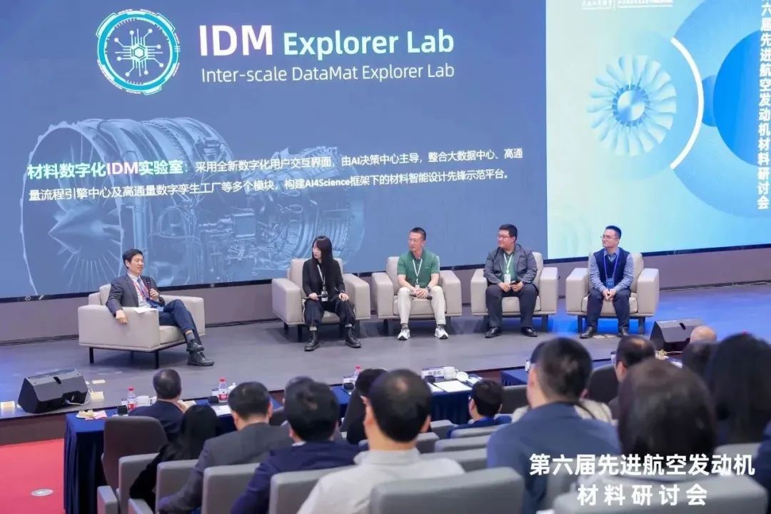精彩的大会报告后,还举行了别开生面的圆桌论坛。徐惠彬院士主持圆桌论坛,向大家全面展示了材料数字化实验室(简称“IDM实验室”)及其核心成员,并由IDM团队介绍其在材料数字化智能设计领域的详细发展规划。IDM实验室依托于北航材料智能设计全国重点实验室及天目山实验室(航空浙江省实验室),采用全新数字化用户交互系统,由人工智能AI决策中心主导,整合大数据中心、高通量流程引擎中心及高通量数字孪生工厂等多个模块,力图构建AI4Science框架下的材料数字化智能设计先锋示范平台。实验室团队在论坛中表示,近些年来材料数据的爆发式增长促使我们寻求更高效及精准的技术手段理解并挖掘材料数据信息,而人工智能技术的成熟应用为此提供了解决方案。IDM团队致力于材料数字化智能设计的研究与实践,力求推动人工智能技术在该领域的深入应用,为未来新材料研发领域注入新的活力。此次论坛展示了人工智能技术与新材料研发领域的深度交叉融合,相信材料数字化智能设计在未来会有更加广阔的应用前景。