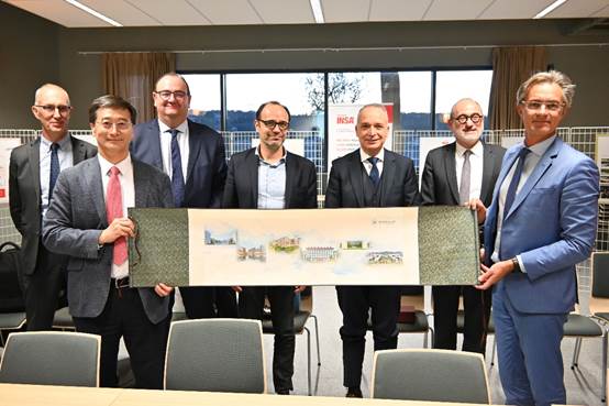在法国国立应用科学学院(以下简称“INSA”)集团,王云鹏校长与INSA集团主席兼INSA图卢兹校长贝尔唐·哈盖(Bertrand RAQUET)、INSA里昂校长佛雷德里克·弗提亚都(Frédéric FOTIADU)、INSA雷恩校长文森特·布鲁尼(Vincent BRUNIE)、INSA鲁昂校长穆拉德·布哈法(Mourad BOUKHALFA)、INSA斯特拉斯堡校长罗穆阿尔德·博内(Romuald BONÉ)及INSA上法兰西校长阿尔梅尔·德·拉·布尔东奈(Armel De la BOURDONNAYE)等六位校长进行了会谈。各方就在杭州合作办学培养方案、课程设置、师资队伍建设等核心问题进行了深入研究讨论,共同展望了未来合作愿景。王云鹏校长代表学校与INSA集团签署合作办学备忘录,与INSA图卢兹签署校级合作备忘录及学生交换协议,与INSA里昂签署学生交换协议,见证了双方合作的崭新开始。