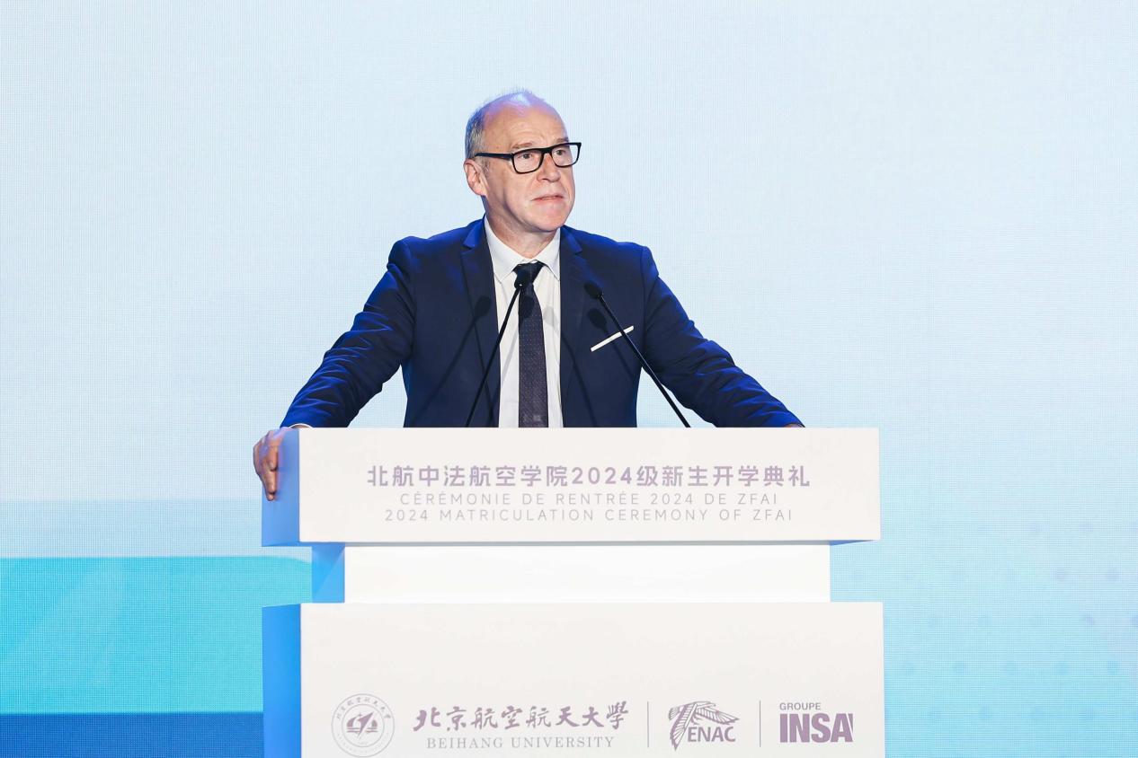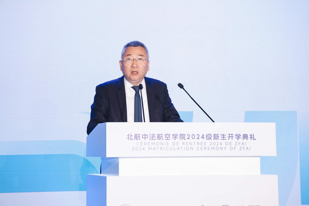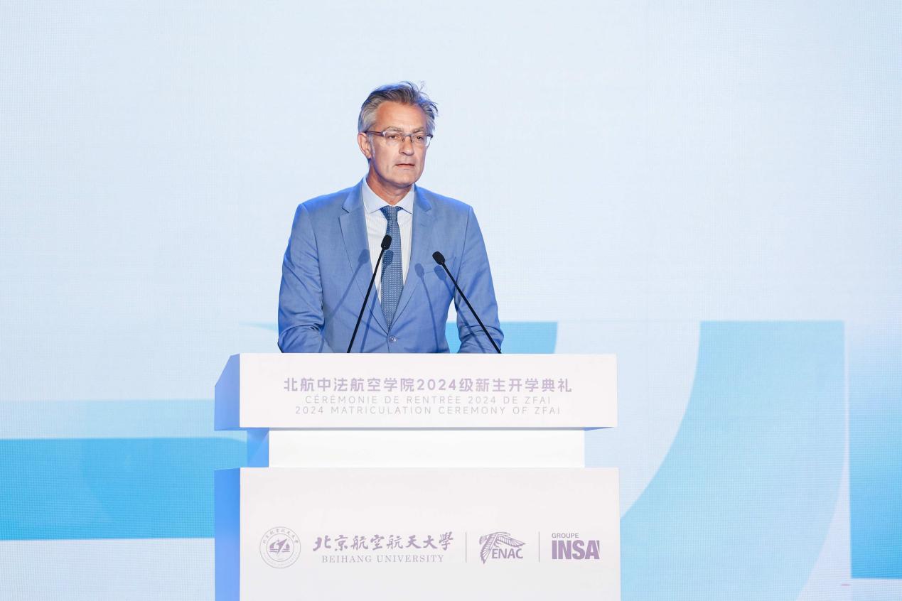 (文/谢雨倩)四时俱可喜,最好新秋时。9月24日上午,北航中法航空学院2024级新生开学典礼在北航杭州国际校园科教美育中心举行,学院又迎来了179名本科生和16名硕士双学位研究生。北航校长王云鹏、法国驻上海总领事馆文化教育处教育领事戴杰明(Benjamin DEMIÈRE)、法国国立民航大学(ENAC)校长奥利维耶·尚苏(Olivier CHANSOU)、法国图卢兹国立应用科学学院(INSA Toulouse)校长贝尔唐·哈盖(Bertrand RAQUET)、北航副校长张海兰、浙江省教育厅国际合作与交流处处长蓝晶晶、法国国立民航大学(ENAC)副校长尼古拉·卡扎利斯(Nicolas CAZALIS)、法国里昂国立应用科学学院(INSA Lyon)副校长达米安·法布雷格(Damien FABRÈGUE)、北航校务委员会副主任何新洲、杭州北航国际创新研究院(学院)党委书记孙青峰,北航中法航空学院中方院长洪冠新、法方院长让帝(Frédéric GENTY)等出席活动。仪式由洪冠新和让帝共同主持。
