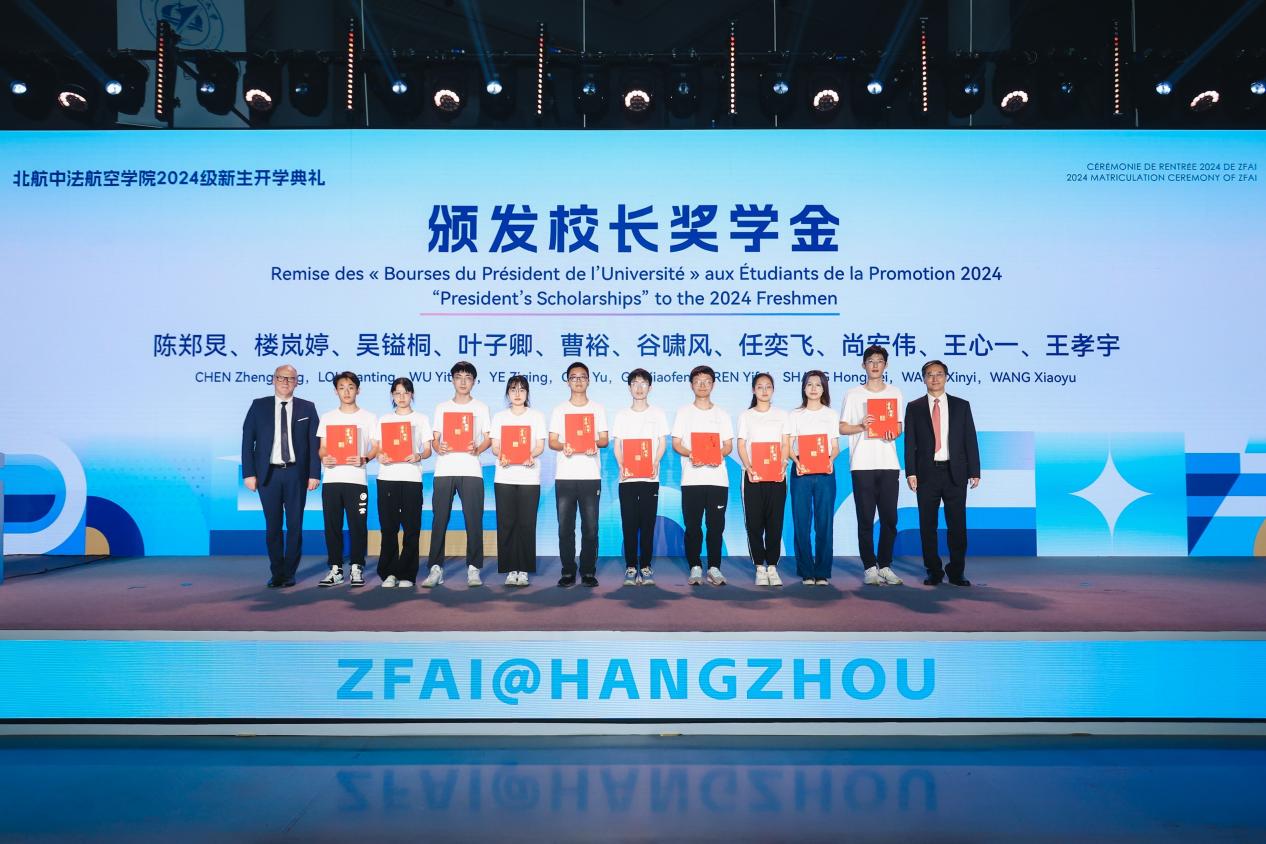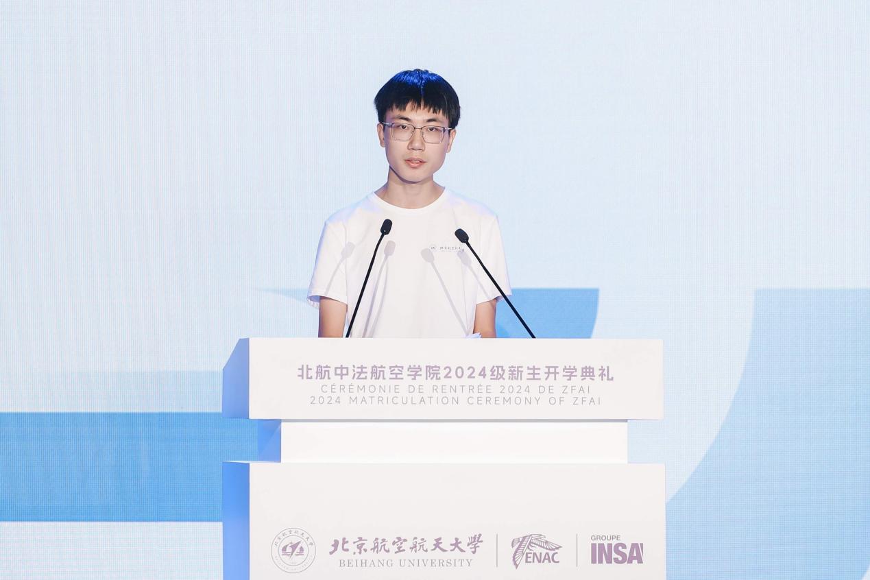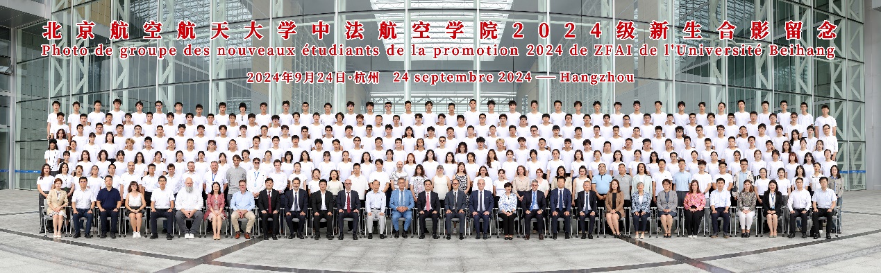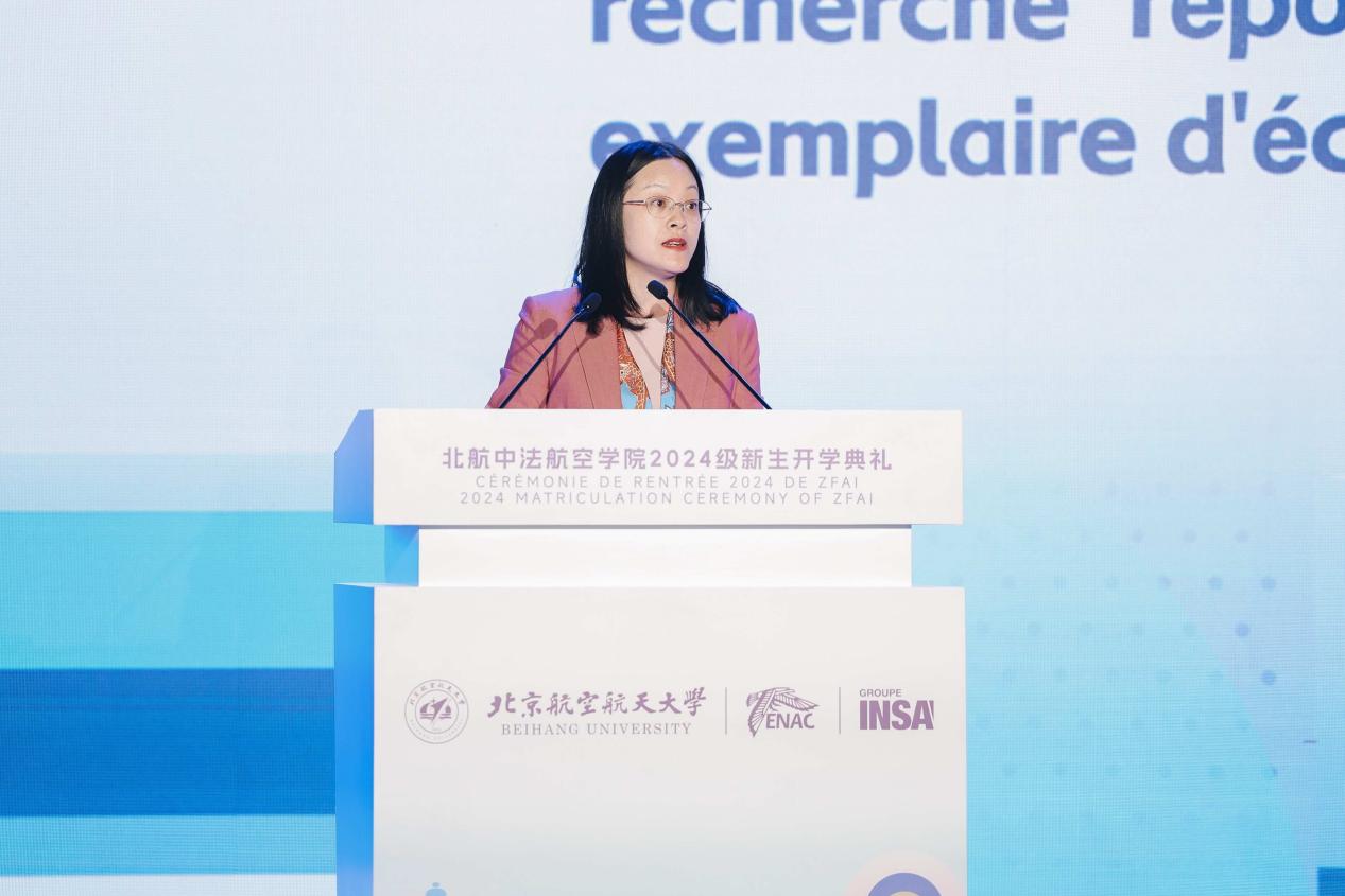 (文/谢雨倩)四时俱可喜,最好新秋时。9月24日上午,北航中法航空学院2024级新生开学典礼在北航杭州国际校园科教美育中心举行,学院又迎来了179名本科生和16名硕士双学位研究生。北航校长王云鹏、法国驻上海总领事馆文化教育处教育领事戴杰明(Benjamin DEMIÈRE)、法国国立民航大学(ENAC)校长奥利维耶·尚苏(Olivier CHANSOU)、法国图卢兹国立应用科学学院(INSA Toulouse)校长贝尔唐·哈盖(Bertrand RAQUET)、北航副校长张海兰、浙江省教育厅国际合作与交流处处长蓝晶晶、法国国立民航大学(ENAC)副校长尼古拉·卡扎利斯(Nicolas CAZALIS)、法国里昂国立应用科学学院(INSA Lyon)副校长达米安·法布雷格(Damien FABRÈGUE)、北航校务委员会副主任何新洲、杭州北航国际创新研究院(学院)党委书记孙青峰,北航中法航空学院中方院长洪冠新、法方院长让帝(Frédéric GENTY)等出席活动。仪式由洪冠新和让帝共同主持。