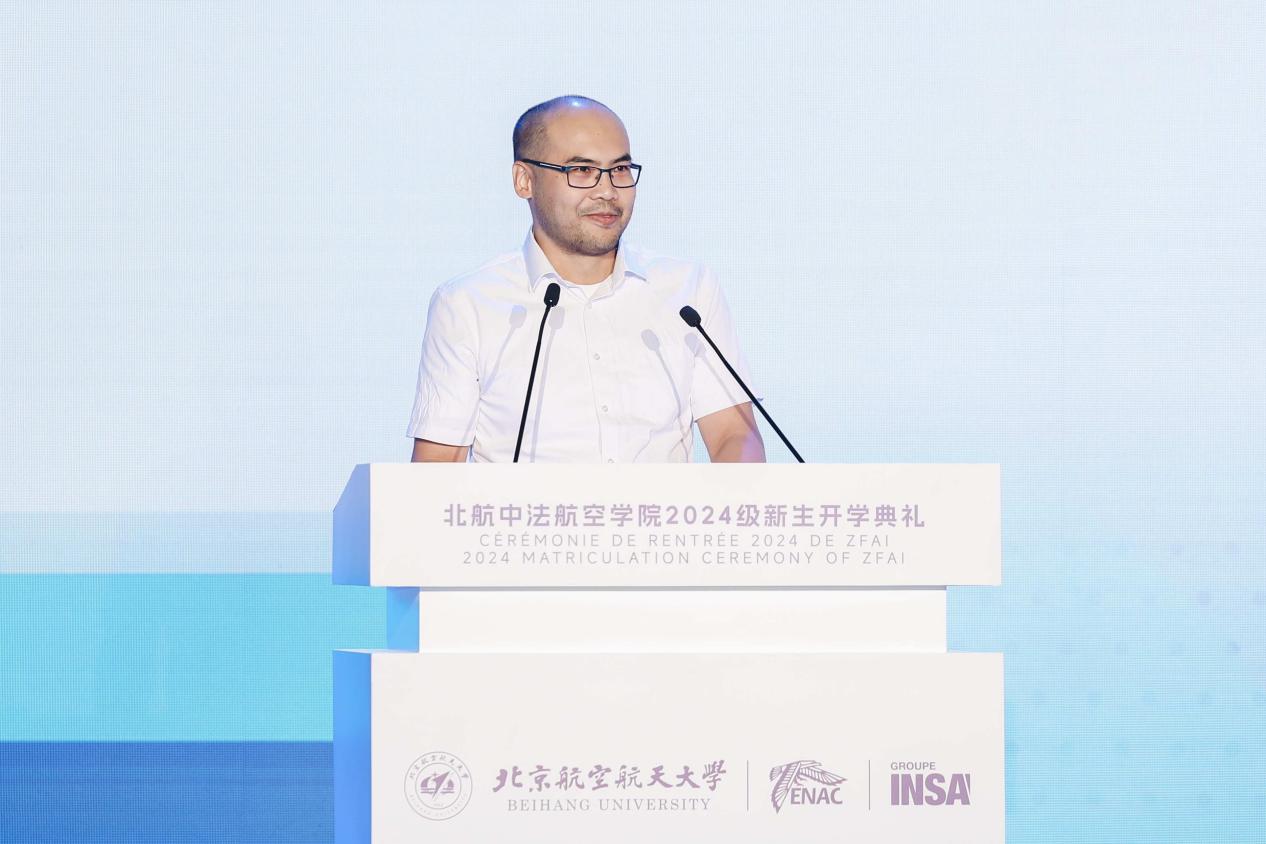 企业代表达索系统亚太区执行副总裁许善淞(Samson KHAOU)向新生们表示祝贺。他表示,航空业融汇了创新、科学和技术,达索系统深耕航空航天领域30余年,与中法航空学院合作建立了中法卓越教育中心,期待未来与北航、ENAC和INSA集团携手共进,大力发展航空培训和研究项目,不断拓宽人类想象力的边界。